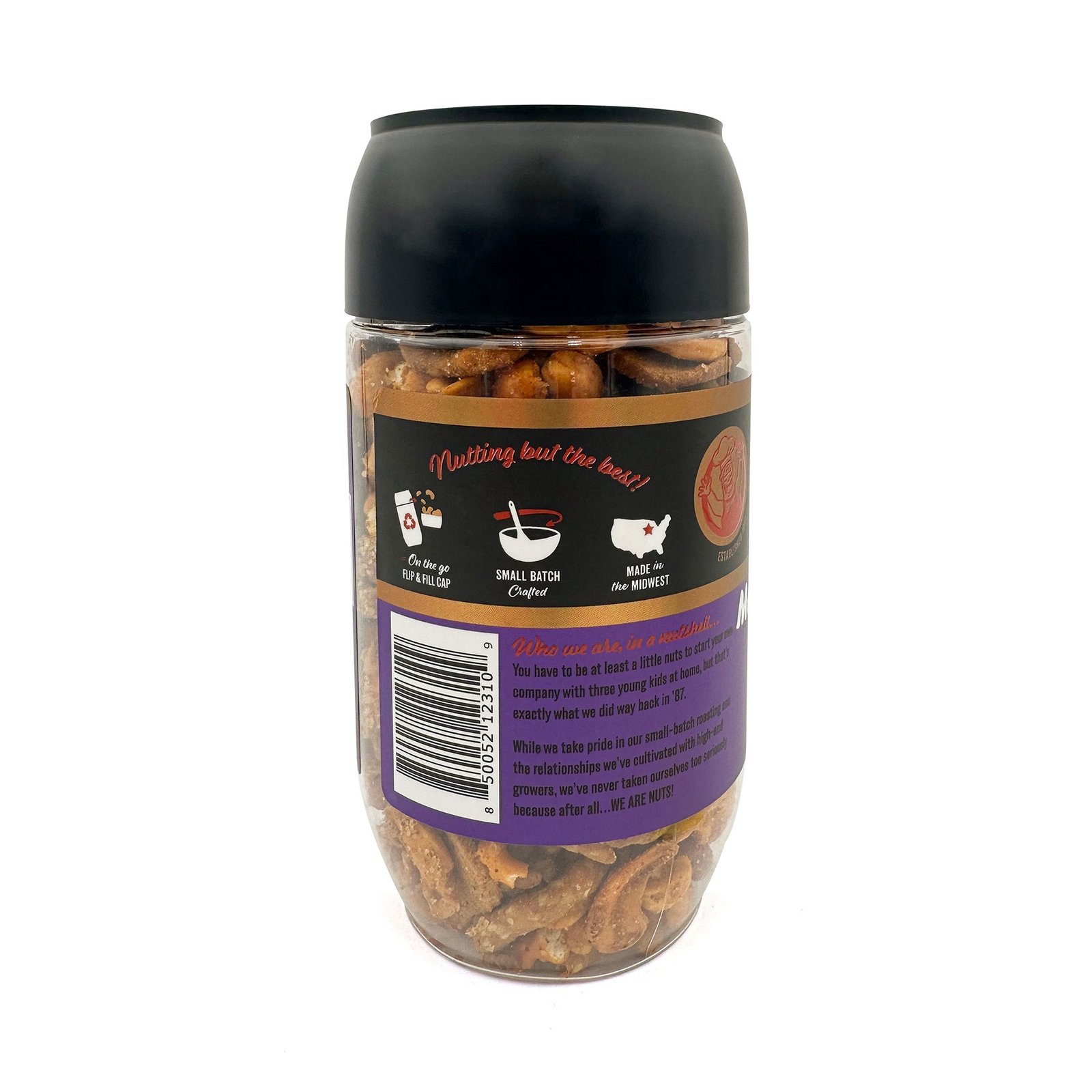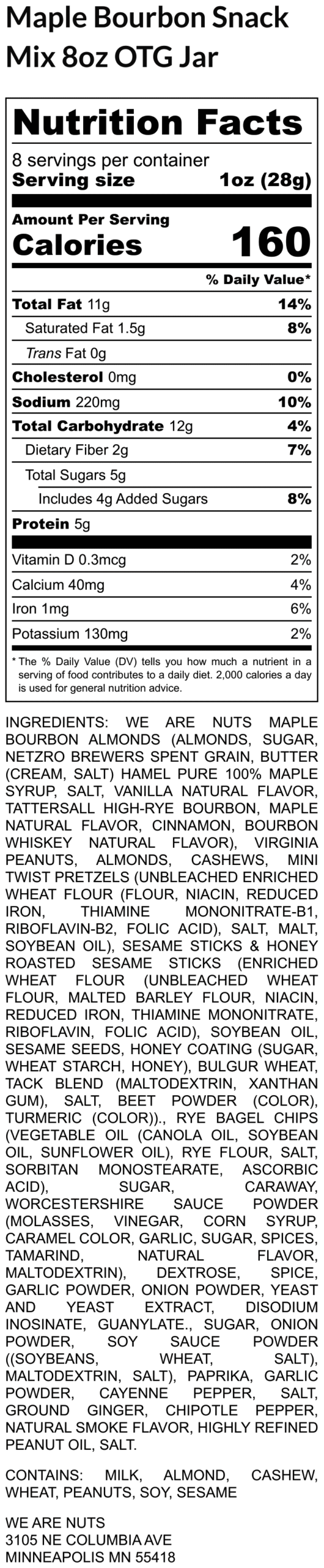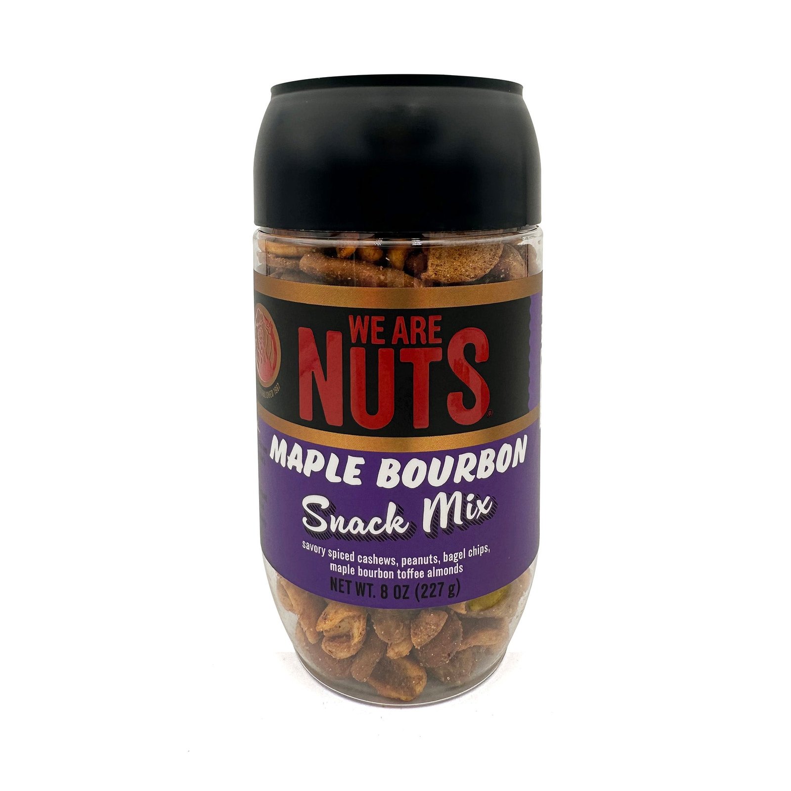 Looking for a snack that hits all the right notes of sweet, savory, and crunchy? Our Maple Bourbon Snack Mix is the ultimate treat! This 8 oz mix is crafted with a delicious blend of savory spiced cashews, peanuts, pretzels, bagel chips, sesame sticks, and honey roasted sesame sticks. But what truly sets this mix apart are our signature Maple Bourbon Toffee Almonds – a rich, indulgent addition that brings a perfect touch of sweetness to complement the savory flavors.