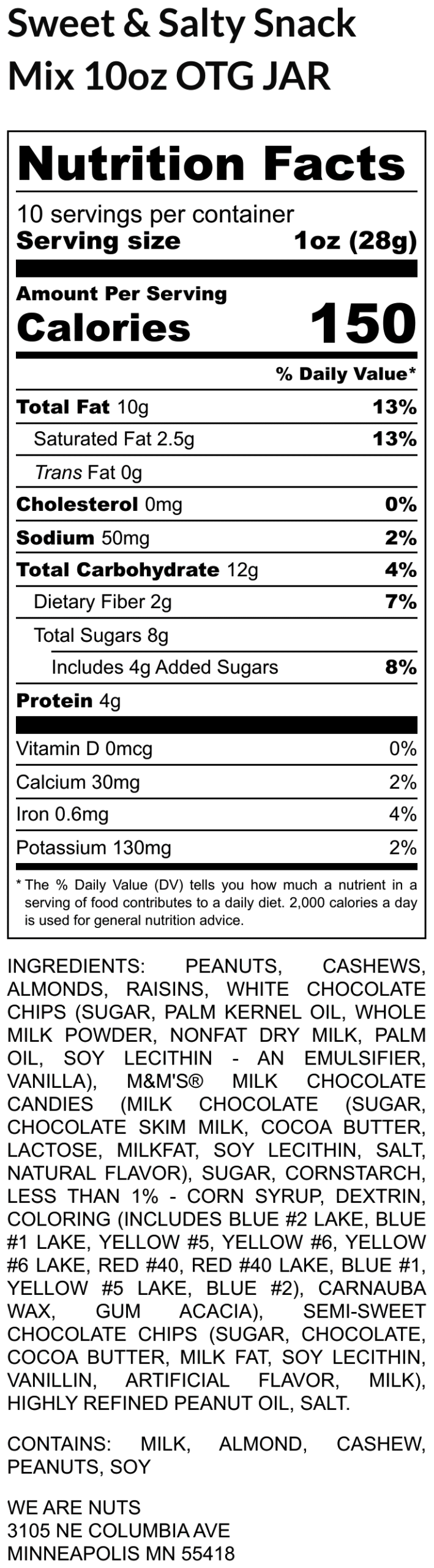 Indulge in the timeless combination of sweet and salty with our Sweet & Salty Snack Mix. This 8 oz blend brings together fresh roasted and salted cashews, almonds, and peanuts with the delightful sweetness of raisins, M&M’s®, and semi-sweet & white chocolate chips. Every bite offers a satisfying mix of crunch and sweetness, perfect for satisfying cravings any time of day.